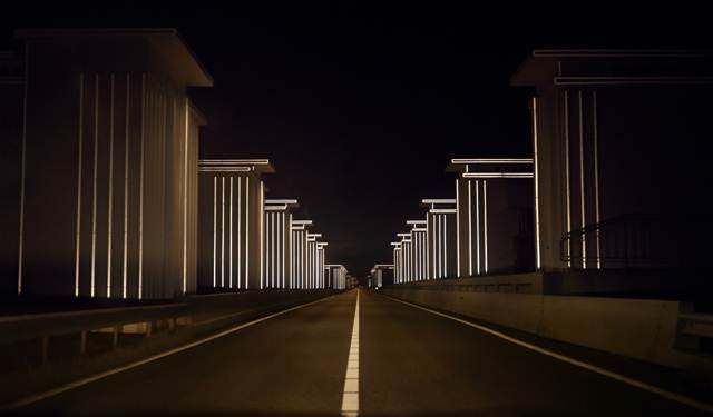 Lichtpoort is de nieuwe entree van de Afsluitdijk Het licht van de koplampen wordt gereflecteerd door kleine prisma’s waardoor de contouren van de gebouwen oplichten.