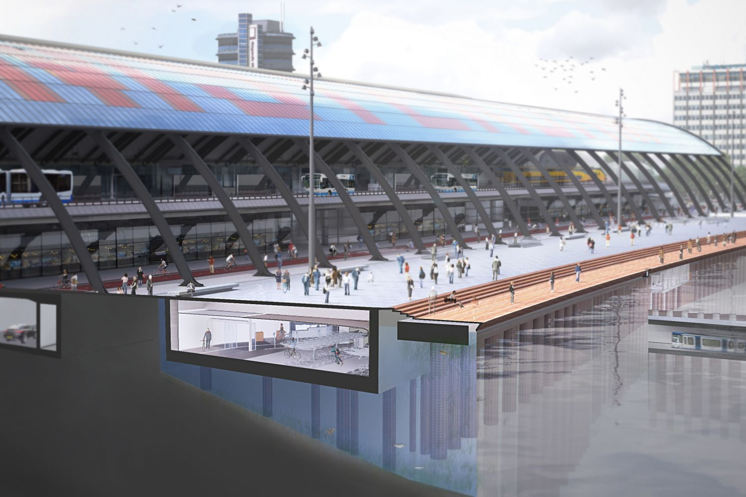 IJboulevard betreft een civiele constructie voor de fietsenstalling die op een externe locatie wordt voorgebouwd en over het water wordt getransporteerd naar de projectlocatie. Hier wordt in het water voor de fietsenstalling een vrijstaande aanvaarbescherming gerealiseerd, die de bestaande kade en de fietsenstalling beschermt tegen eventuele aanvaringen van het scheepvaartverkeer op het IJ. De fietsenstalling wordt bouwkundig ingericht met een verlaagd plafond en technische installaties, ook voor het fietsparkeren.