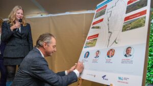 1 oktober 2024 – De realisatiefase van de dijkversterking en – verlegging in Arcen gaat nu echt van start. Dit bekrachtigden minister Barry Madlener, wethouder Marij Pollux, gedeputeerde Michael Theuns en waterschapsbestuurder Jeroen Achten met hun handtekening onder de realisatieovereenkomst.